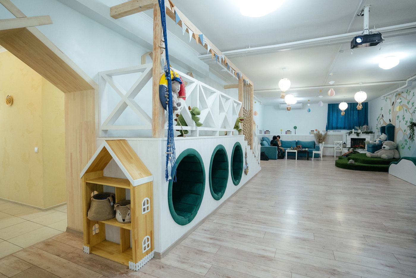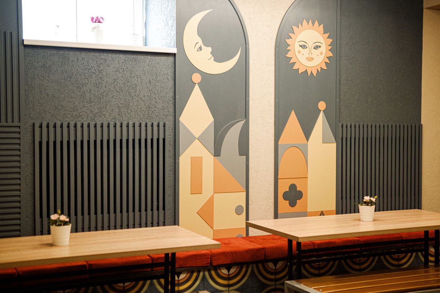 Интерьер зала (ул. Стофато, 14) состоит из игровой комнаты и кухни-столовой со столами и 36 стульями. В игровой зоне есть мягкая зона с диванами.