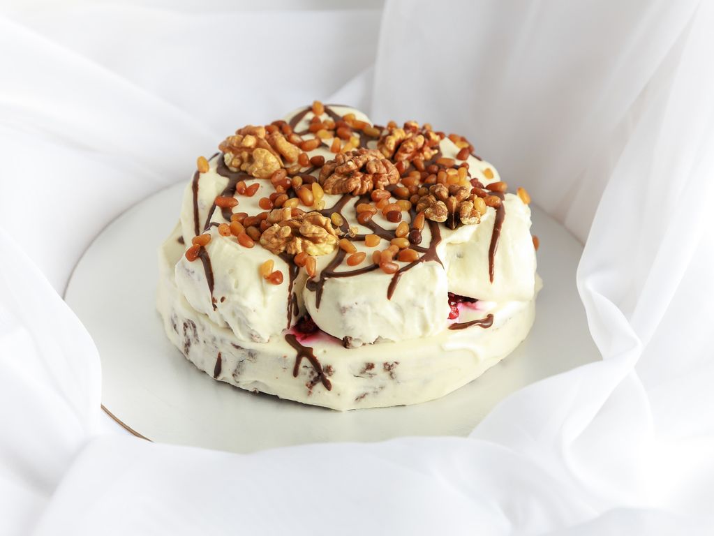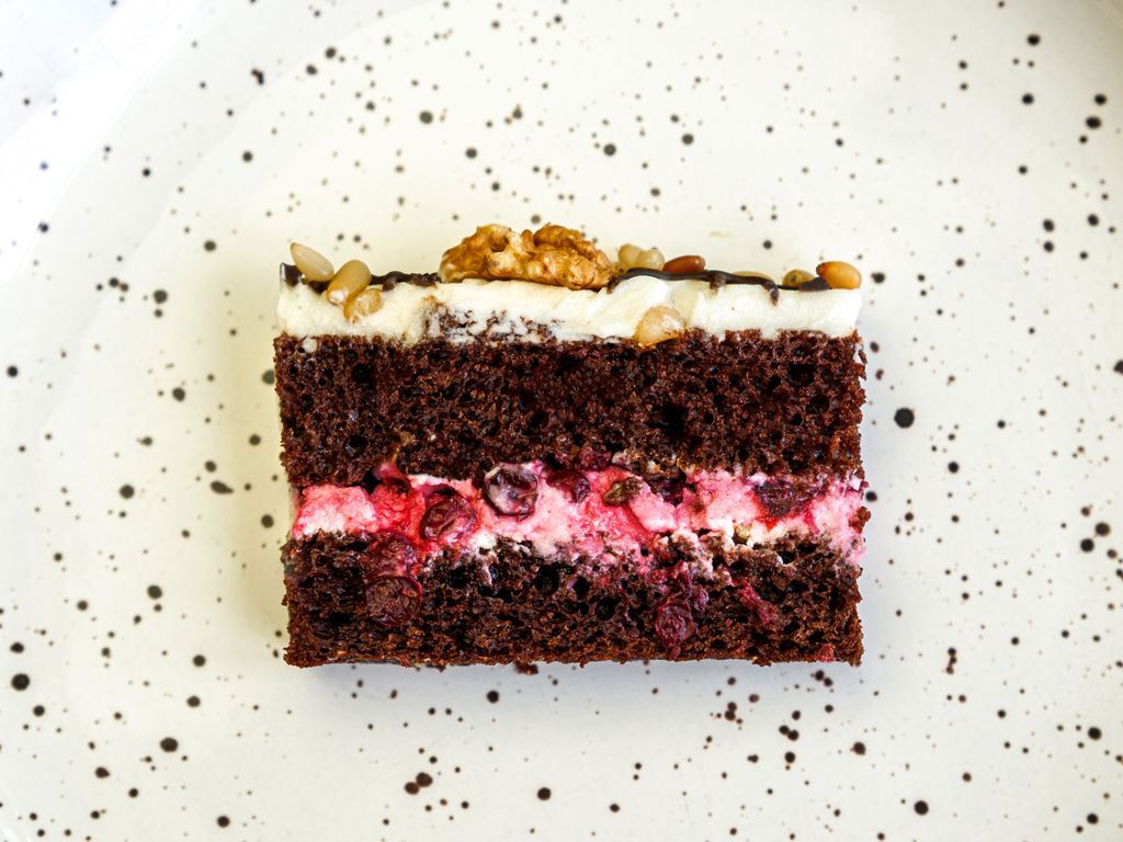 Состав: сахар/сливки/сметана/мука/брусника с/м/яйцо/орех кедровый/орех грецкий/какао-порошок/глазурь шоколадная/сода/кислота аскорбиновая/ванилин.