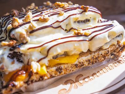 Состав: сливки/сахар/сметана/персик консервированный/мука/яйцо/молоко сгущенное/орех грецкий/гель кондитерский/какао-порошок/сода пищевая/кислота аскорбиновая/ванилин.