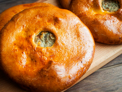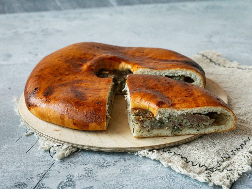 Состав: мука/фарш (говядина/свинина)/лук репчатый/сыр адыгейский/яйцо/укроп/маргарин/сахар/соль/дрожжи/аджика/перец чёрный молотый.