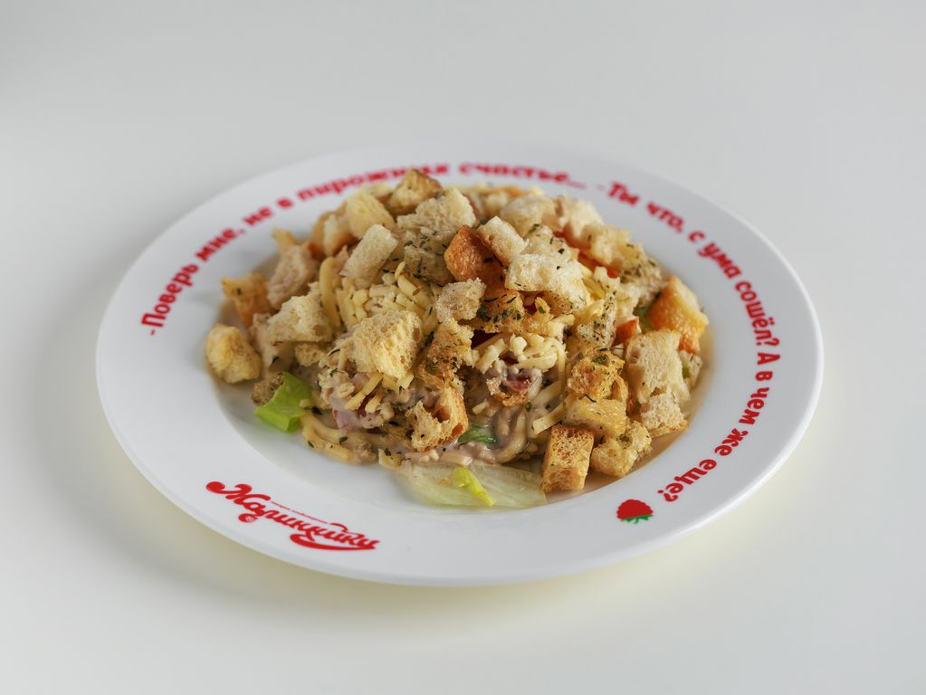 Состав: филе куриное/лист салата/помидор/соус цезарь (майонез/молоко/соус соевый/масло подсолнечное/сыр/чеснок/чабрец/перец)/сыр/сухарики хлебные/масло чесночное.