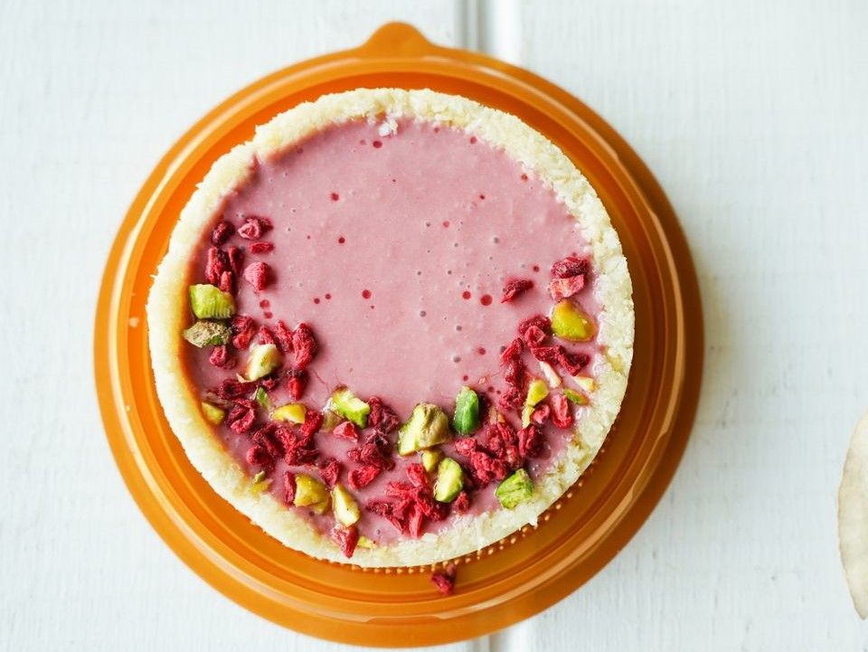Состав: малина с/м/стружка кокосовая/сироп топинамбура/кешью/пюре кокосовое/какао-масло/фисташка очищенная/семена чиа/малина сублимированная.