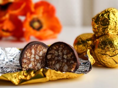 Состав: ядра миндаля/ядра арахиса/мёд/шоколад темный/сахар, какао тертое, какао-масло, какао-порошок, лецитин, ванилин/патока/глазирователь.