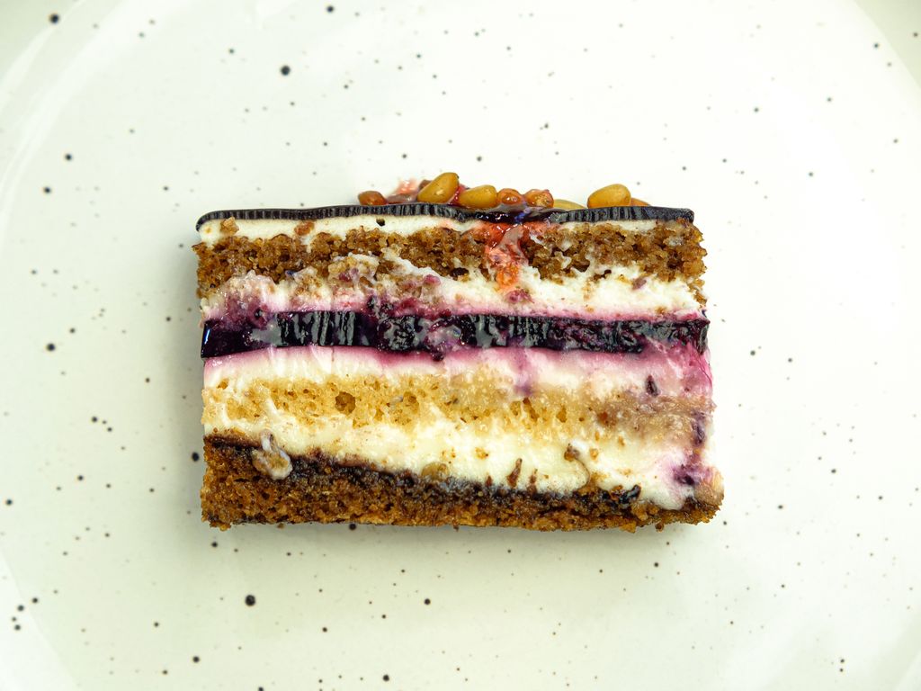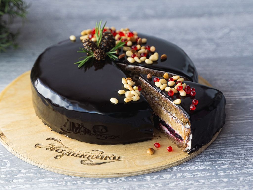Состав: сахар/сливки/сметана/смородина с/м/молоко сгущенное/яйцо/талган ячменный/мука/какао-порошок/черемуха молотая/орех кедровый/желатин/цукаты из шишек/гель кондитерский/масло сливочное/сода/кислота аскорбиновая/ванилин/коньяк.