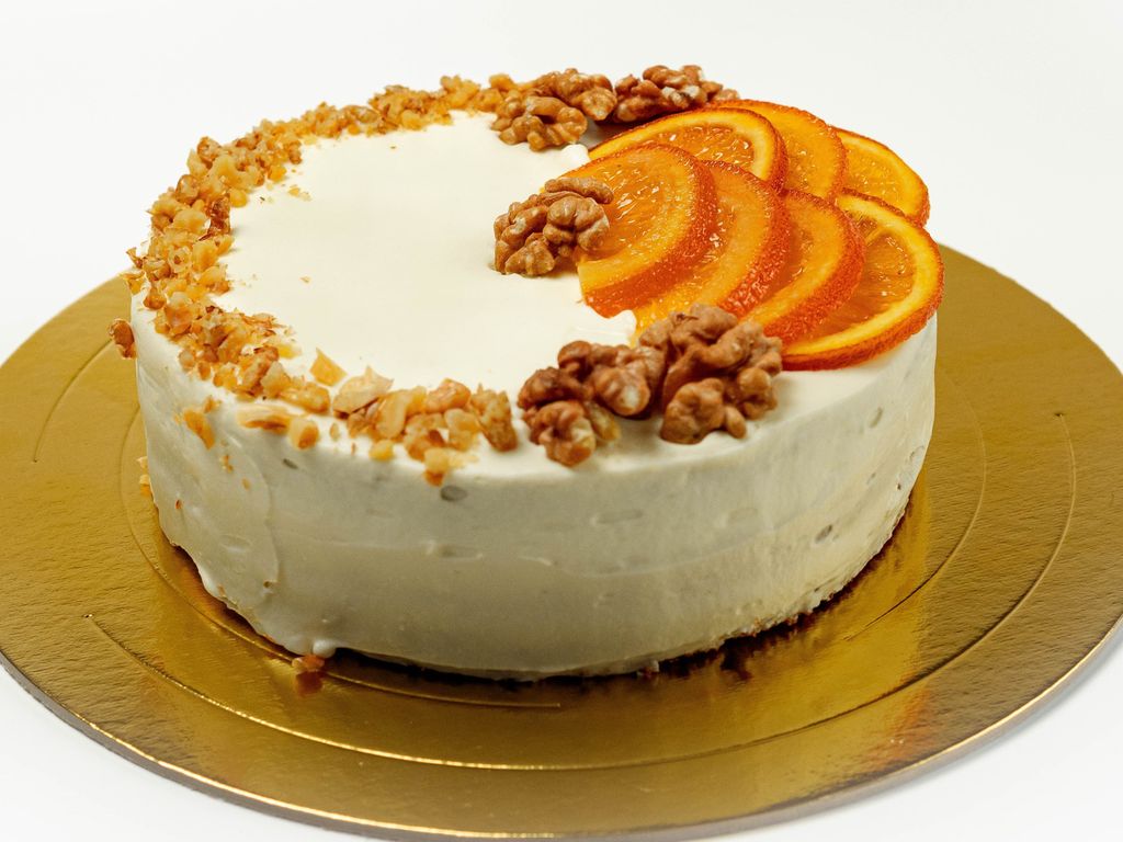 Состав: сахар/сливки пастеризованные/сыр творожный/морковь/мука 1с/орех грецкий/яйцо/масло подсолнечное/цукаты апельсиновые/сметана/мёд/клюква вяленая/изюм/крахмал кукурузный/разрыхлитель/сода пищевая/корица молотая/орех мускатный/соль/кислота аскорбиновая/гвоздика.