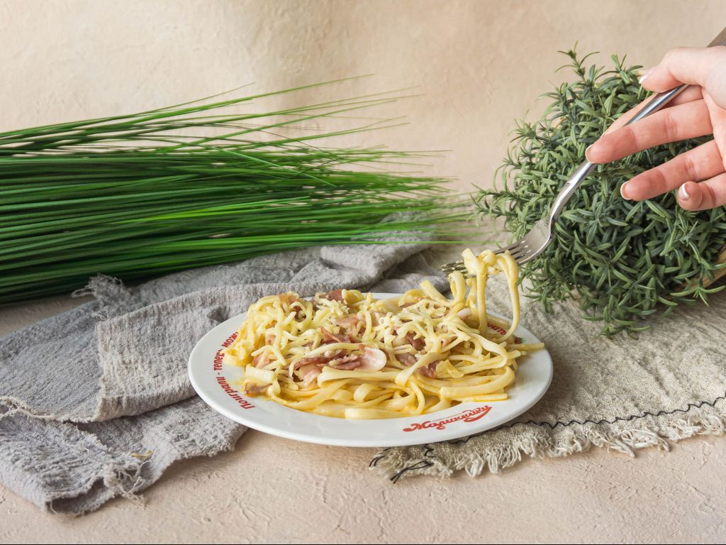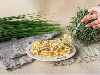 Состав: спагетти лингвини/вода/бекон сырокопченный/сыр/сыр творожный/лук репчатый/масло подсолнечное/чеснок/масло сливочное/бульон куриный/соус соевый/паста томатная/сахар/ соус сладкий чили/укроп/перец черный молотый/перец чили.