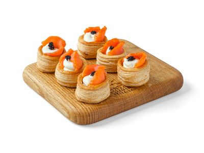 Состав: сыр творожный/форель х/к/мука/маргарин/икра летучей рыбы/яйцо/сахар/дрожжи/соль.