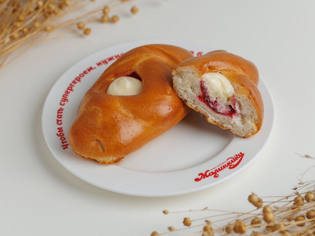 Состав: мука/брусника с/м/сахар/вода/сливки/яйцо/сметана/дрожжи/масло подсолнечное/маргарин/крахмал/соль/кислота аскорбиновая/ванилин.